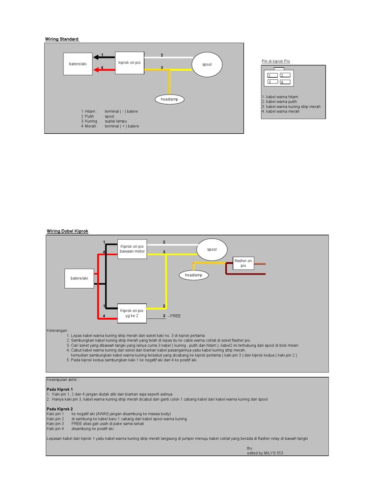 Unduh gambar Skema Kabel Body Scorpio. Kabel kuning adalah tegangan positif disambung ke kunci kontak posisi ON.